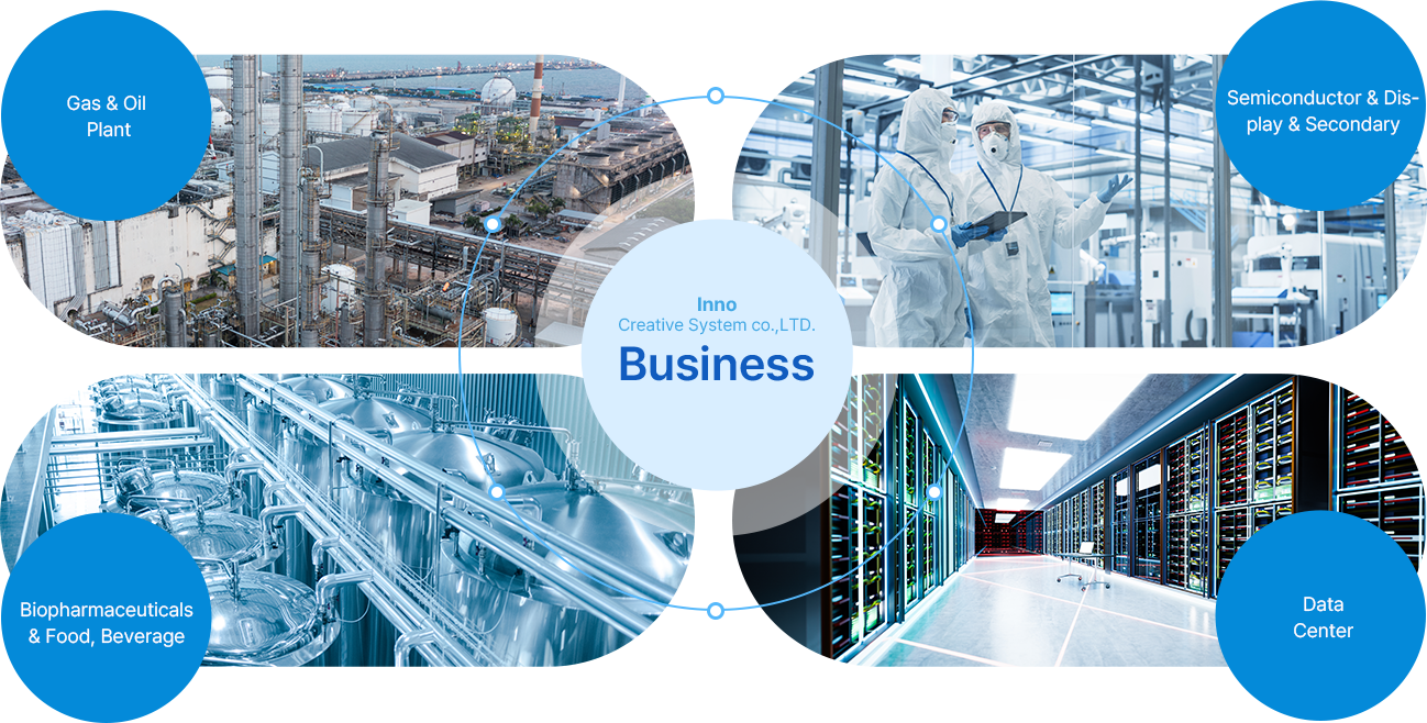 Inno Creative System has been expanding its business area by focusing on electricity, telecommunication, and plumbing construction, and has developed and applied the heater control & monitoring system with our own technology to establish a smooth transfer system for organisms required in industries such as semiconductor special gas plants and petrochemical plants.